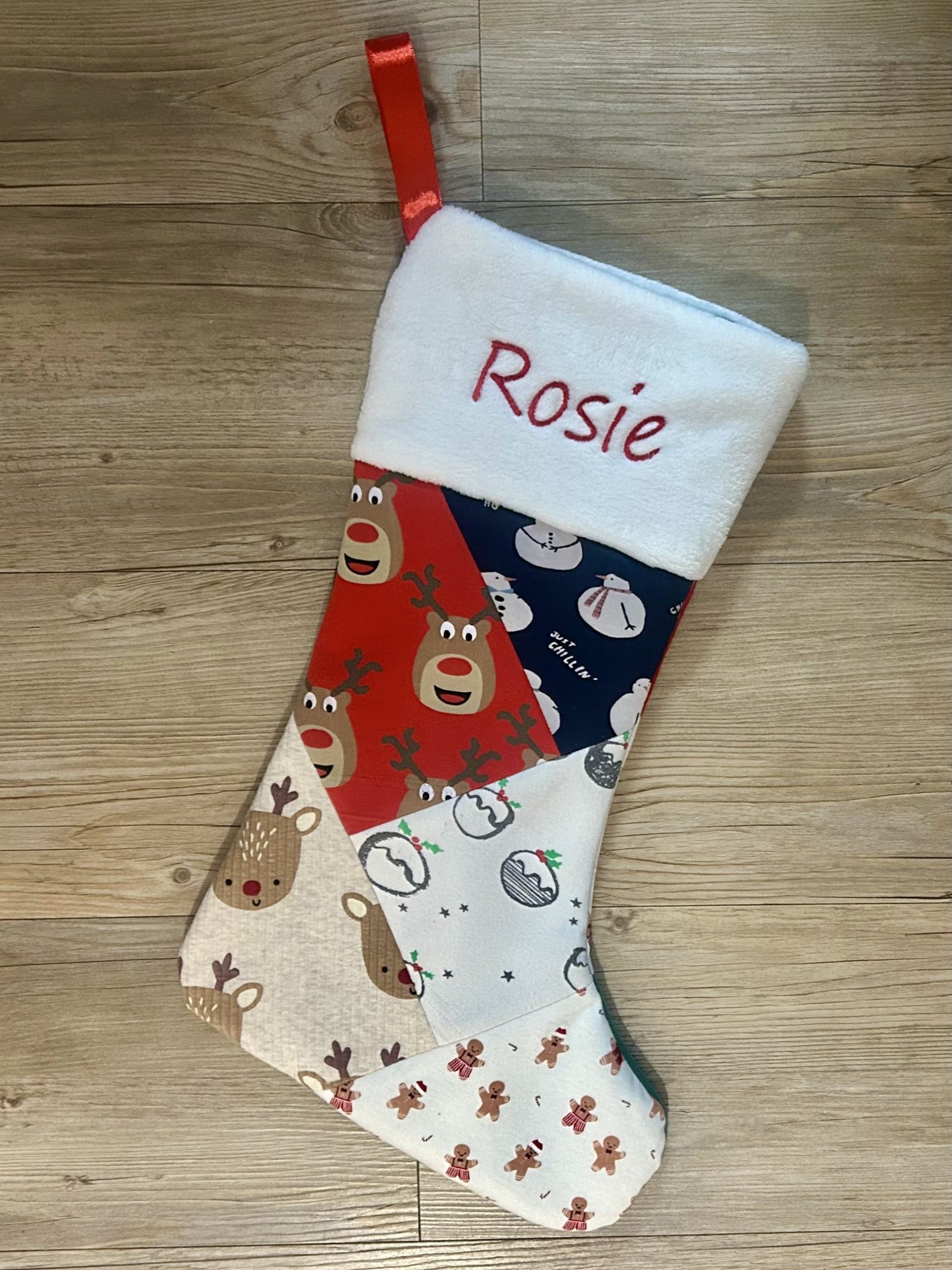 These beautiful Christmas Stockings are made using your loved one’s precious clothing, and include an embroidered name as shown in the pictures. The stockings are approximately 25x45cms and are double sided. They are made using about 10 squares patches and require about 5-10 items of baby clothing. They cuff is made using a lovely soft white fleece fabric and they are fully lined with cotton.